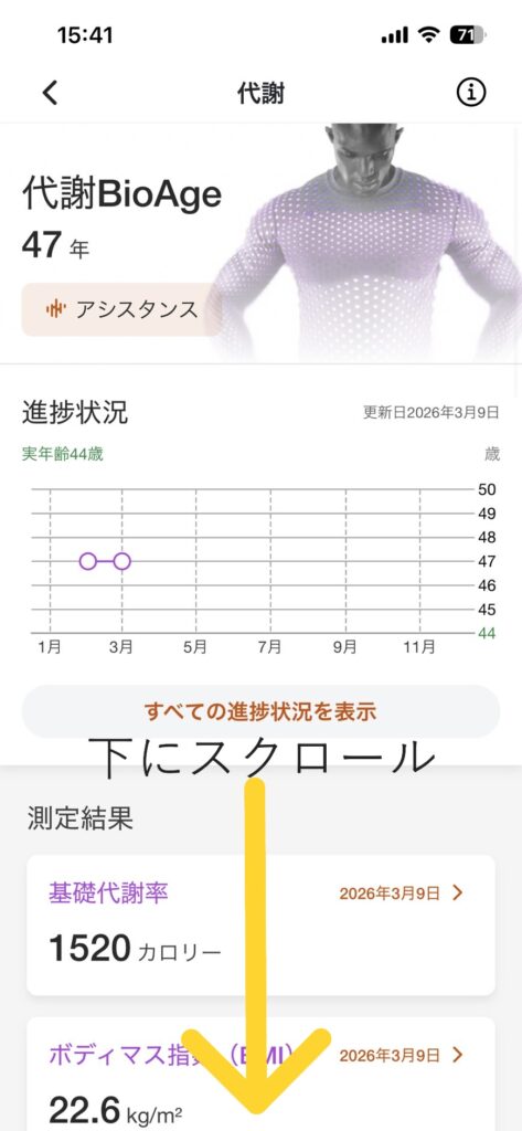 アプリでは、骨格筋量・体重・体脂肪率・基礎代謝量など、身体に関する多くのデータを時系列でチェックできます。