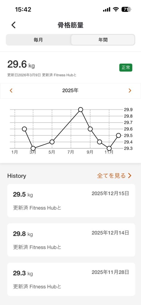 骨格筋量をタップすると、月ごと・年ごとの推移がグラフで確認できます。