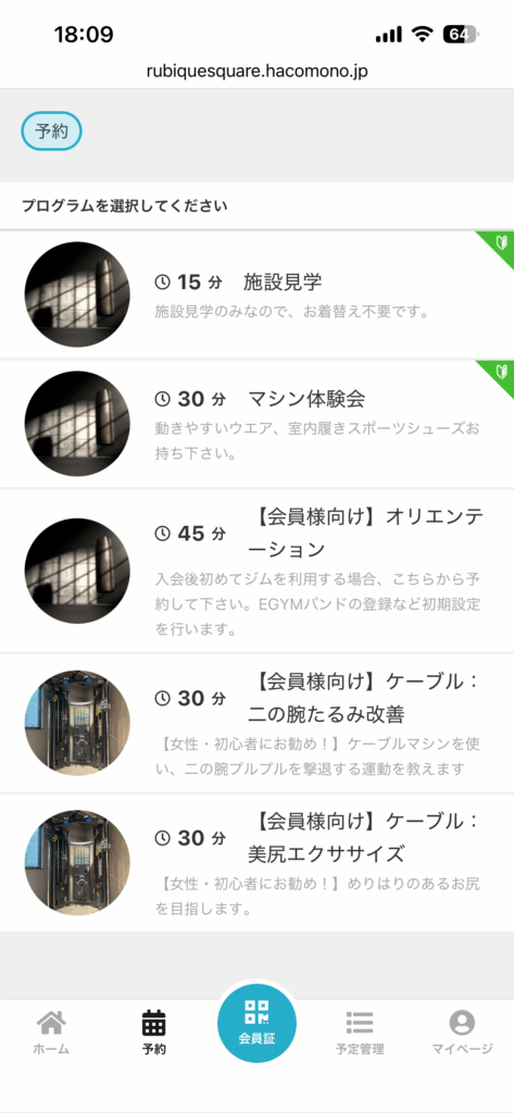 ログイン後にプログラムが表示され、予約できるようになります。