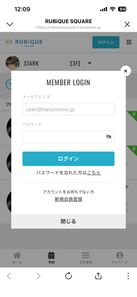 hacomono 予約・会員管理システムの画面でログインしてください。